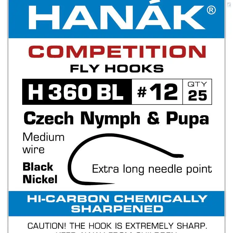 Hanak H360BL Czech Nymph & Pupa is an universal barbless Czech Nymph & pupa hook with a bent up eye.