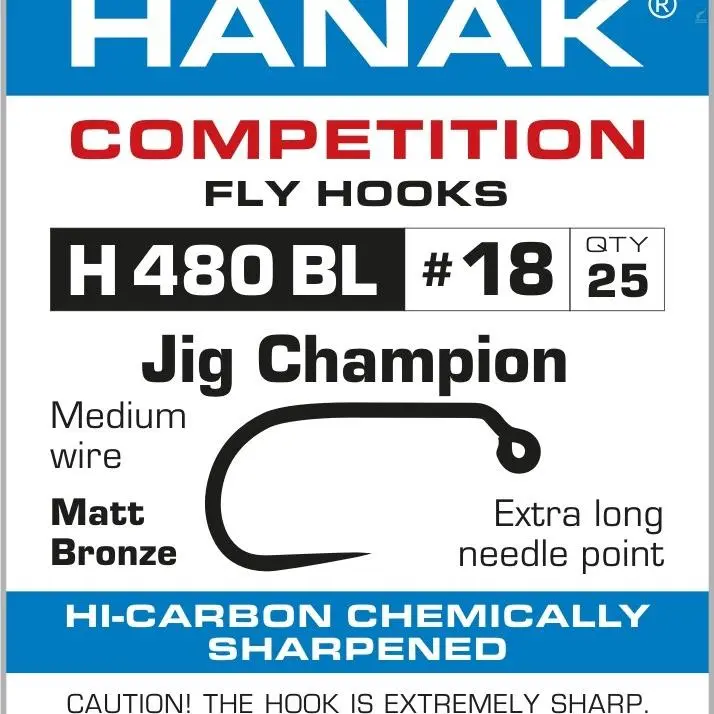 Hanak H480BL Jig Champion is an improved barbless jig hook with extra wide gape for use with various beads. Use for nymphs and minileeches.