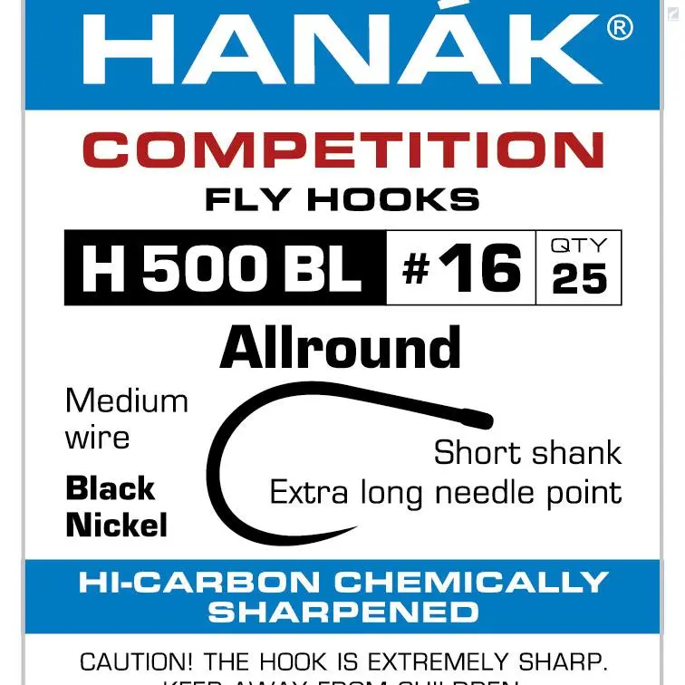 Hanak H500BL Allround is an universal barbless hook with short shank , extra-wide gape and straight eye and bent-in point. Use for pupae, larvae and many other insect imitations.