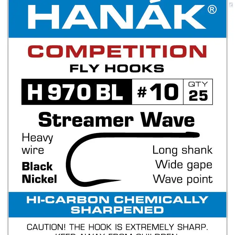 Hanak H970BL Streamer Wave is strong barbless & extended hook for streamers. The hook has extra wide gape, straight eye and wave point. Use for various streamer patterns.