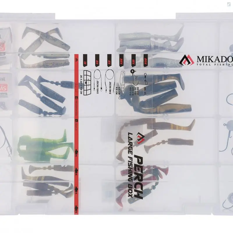 Mikado Large Set Perch Soft Lure Kit is ready to go set for perch fishing. Small jigs are also suitable for zander. Package includes 20 snaps, 12 jig heads, 40 perch jigs, 2 steel leaders, 2 fluorocarbon leaders and a lure box for storing them all. This kit makes starting fishing perch easy.