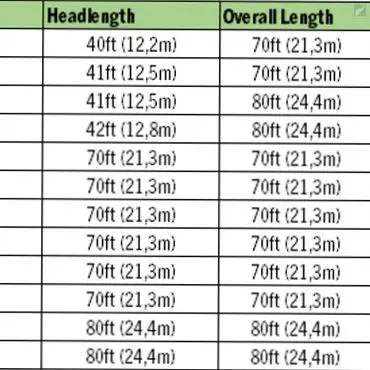 | Line Size | 30ft Head Weight | Total Head Weight | Head Length | Total Length |