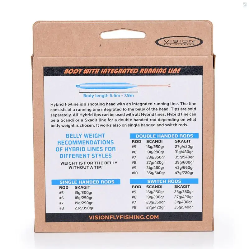 Vision Hybrid Fly Line is what you want it to be! It is a shooting head with an integrated running line. The line consists of a running line integrated into the head. Hybrid tips are sold separately. We are giving you the option to choose what you want from this line. First choose your style. Scandi, Skagit, Switch or Single Handed. Then select the proper weight of the belly for your selected style from our recommendation chart. Lastly buy a separately sold tip in the length you desire. All Hybrid tips will work on all Hybrid fly lines. You can also use Vision’s ACE T-tips.